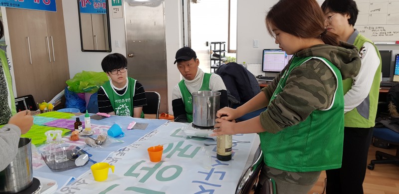 쓰레기 정화 후 홀로계신 어르신들에게 나눠주기위해 EM 천연비누만들기도 하였습니다.